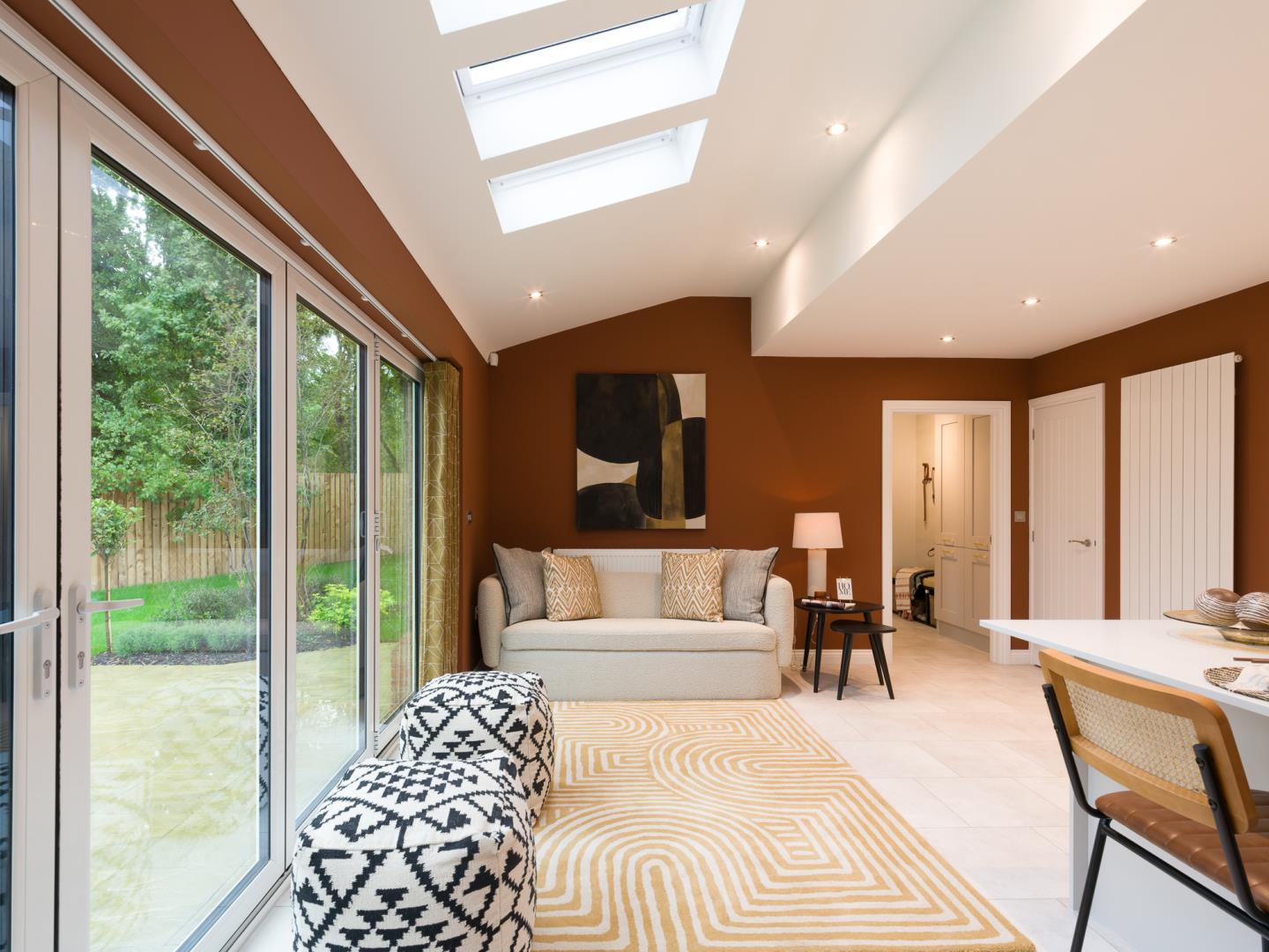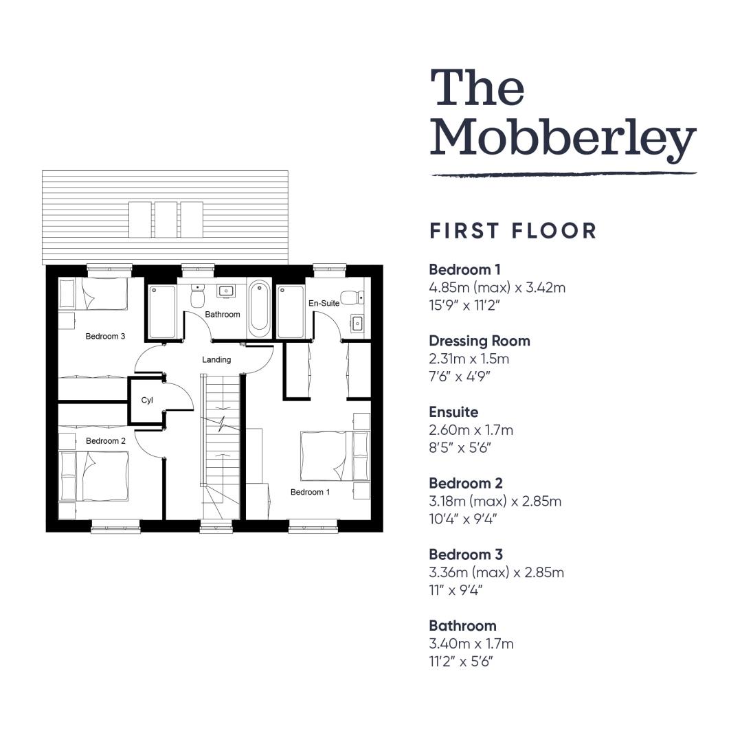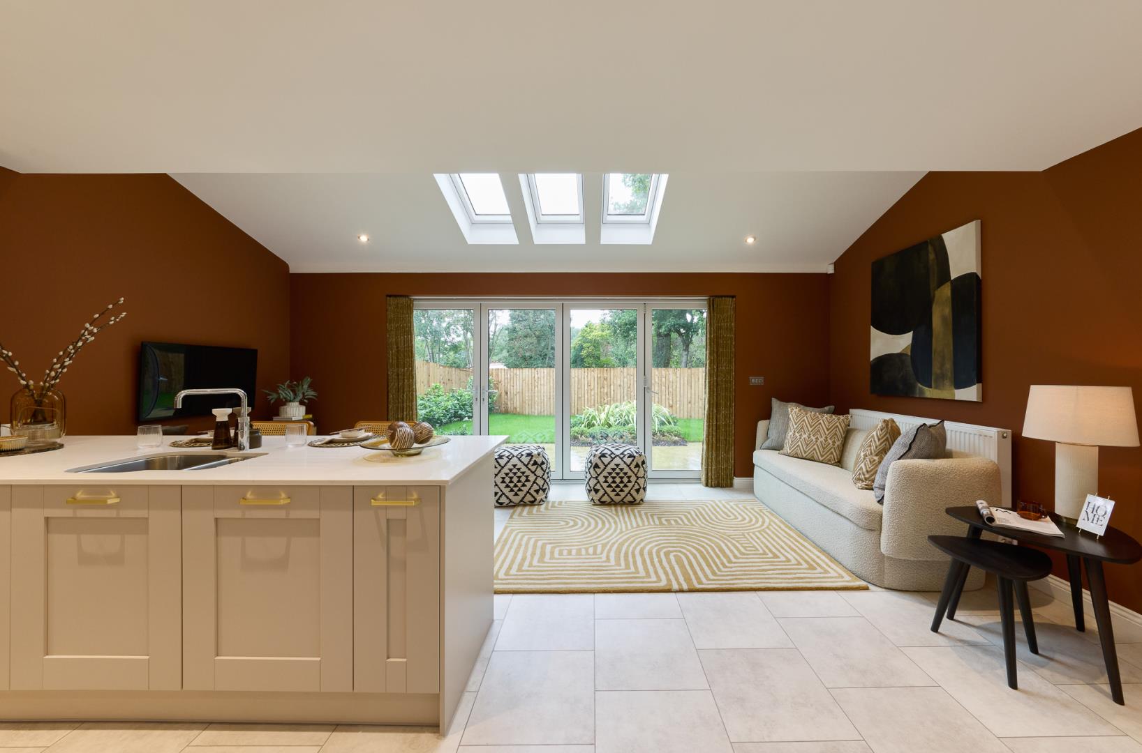 THE MOBBERLEY is a five bedroom detached executive family home, with large open plan kitchen and family room with feature roof light windows and access to the rear garden through French doors. Useful utility room, separate living room and dining room, downstairs WC. Five spacious bedrooms, dressing area to the main bedroom and ensuites to both the main and second bedrooms, two further family bathrooms, storage and and detached double garage.