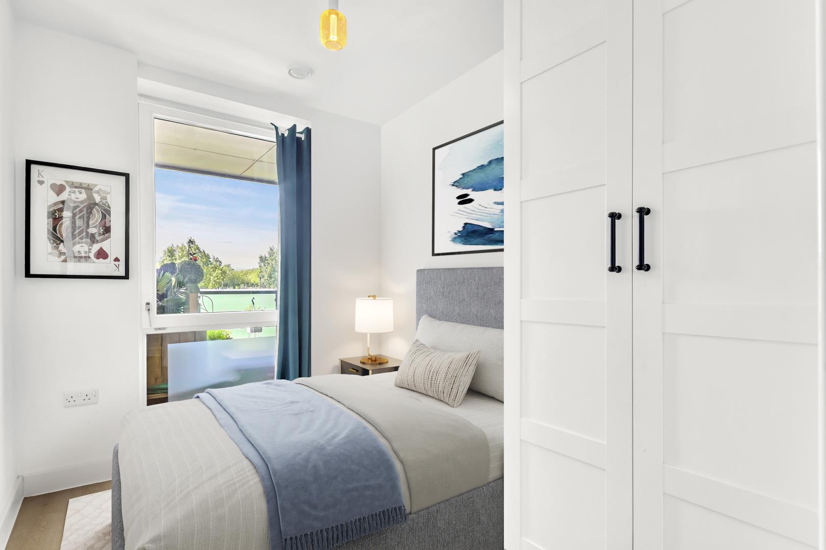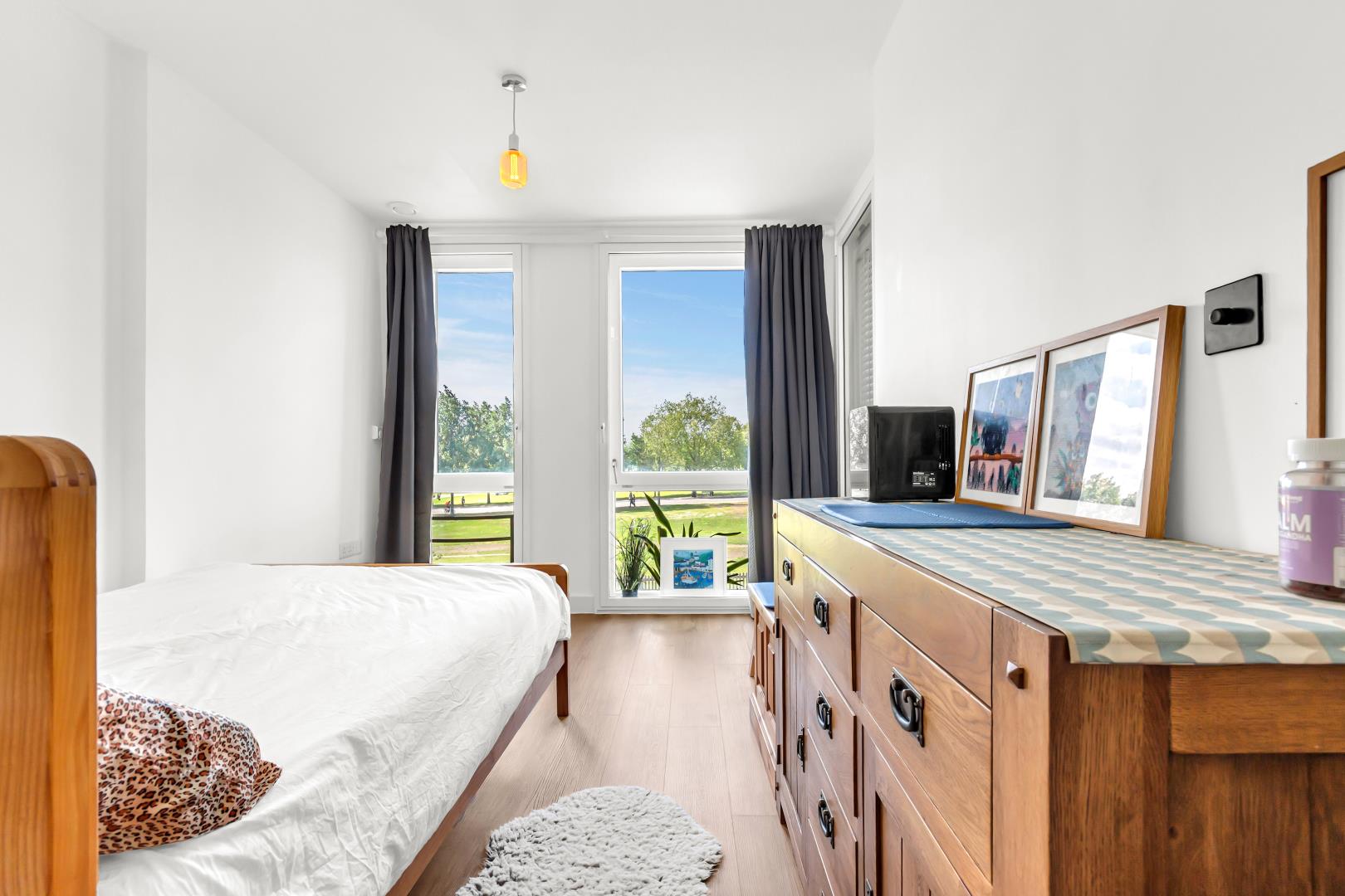 To the right of the turning in the hallway is access to the kitchen and further to left is the second bedroom. This bedroom has a large floor to ceiling window looking onto the park and Victorian style geometric flooring.