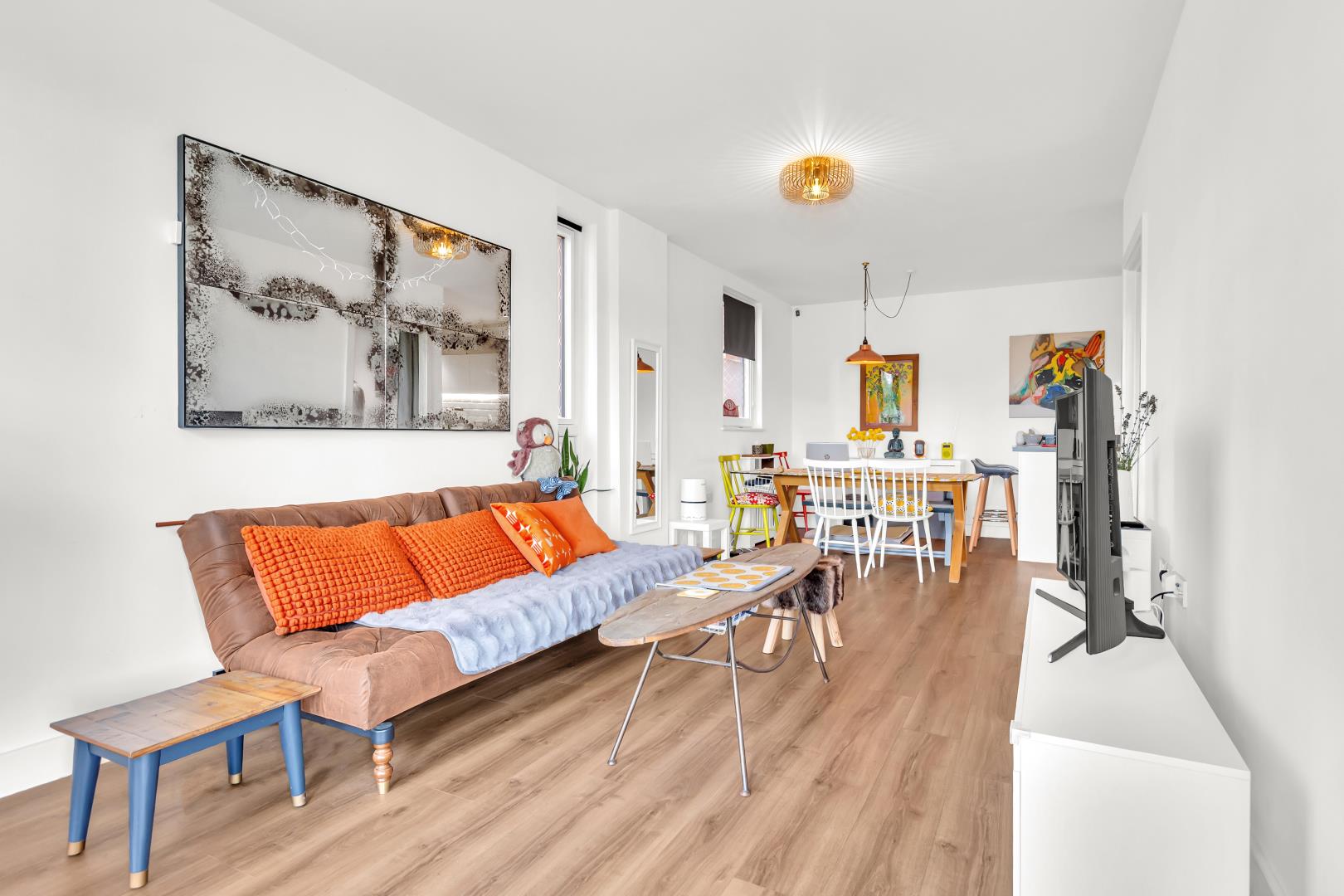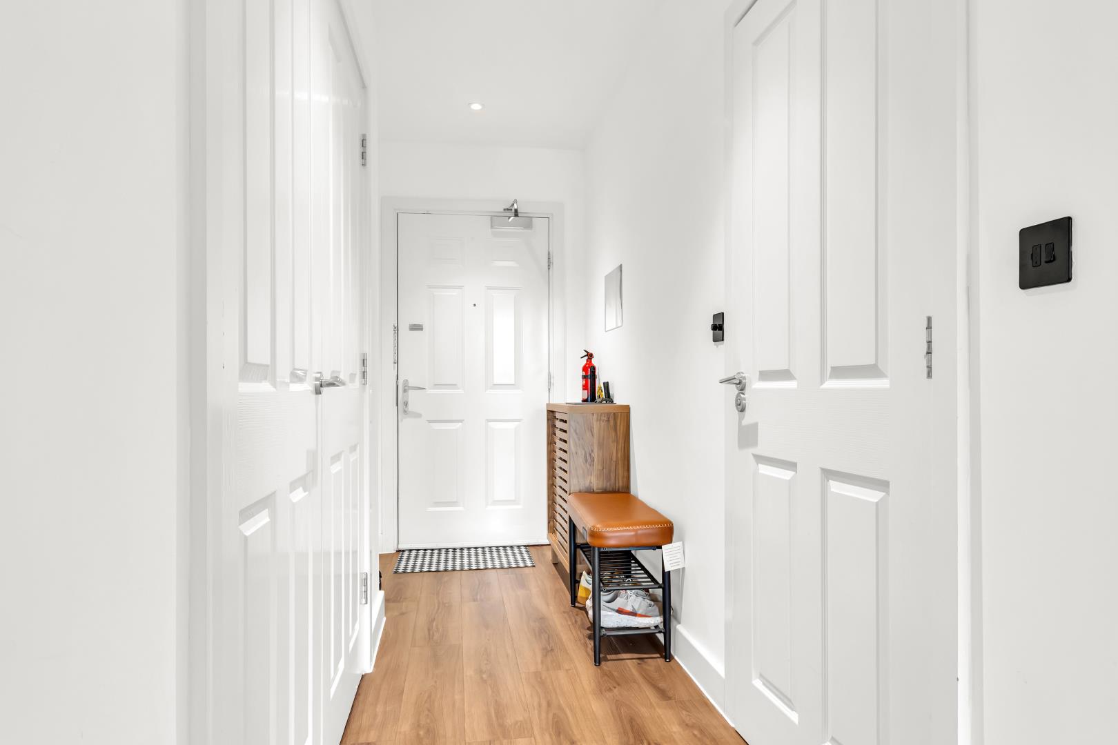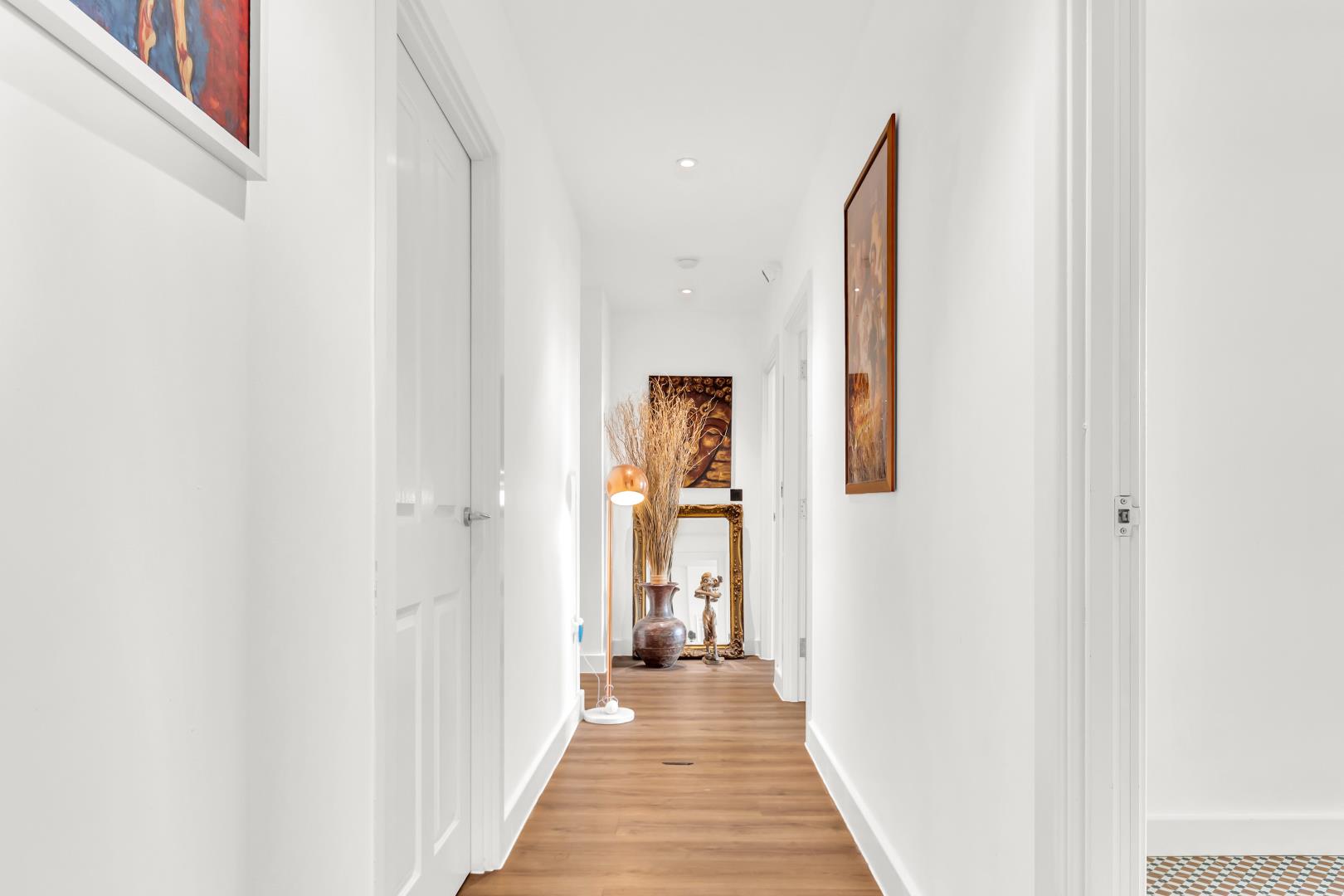 At the entrance there’s a wide hallway with wooden flooring which runs through the property.